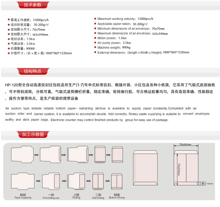 全自動高速信封紅包機(jī)主要就是生產(chǎn)效率非常高一種專門生產(chǎn)各種紅包紙袋的機(jī)械設(shè)備,設(shè)備運(yùn)行起來非常穩(wěn)定。隨著社會的不斷發(fā)展,這樣的機(jī)器設(shè)備用途非常廣泛,能在很多行業(yè)領(lǐng)域中應(yīng)用,尤其是在包裝行業(yè)應(yīng)用是**為廣泛的,不同的行業(yè)應(yīng)用會有不同的作用。HP-120型全自動高速信封紅包機(jī)的生產(chǎn)工藝非常精細(xì),設(shè)備采用的都是優(yōu)質(zhì)的材料制作而成,因此,機(jī)器設(shè)備在操作的過程中性能非常優(yōu)越,基本上是不會出現(xiàn)任何故障問題,機(jī)械性能很穩(wěn)定。